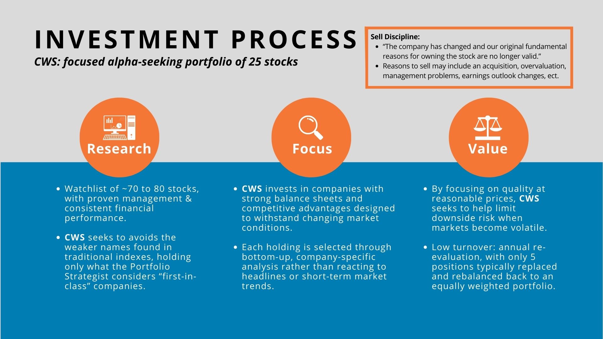 - Disciplined Alpha Seeking Strategy — CWS is focused on a core group of what we believe are outstanding firms, offering investors a simple way to get instant exposure to a concentrated equity portfolio of companies with proven competitive advantages.