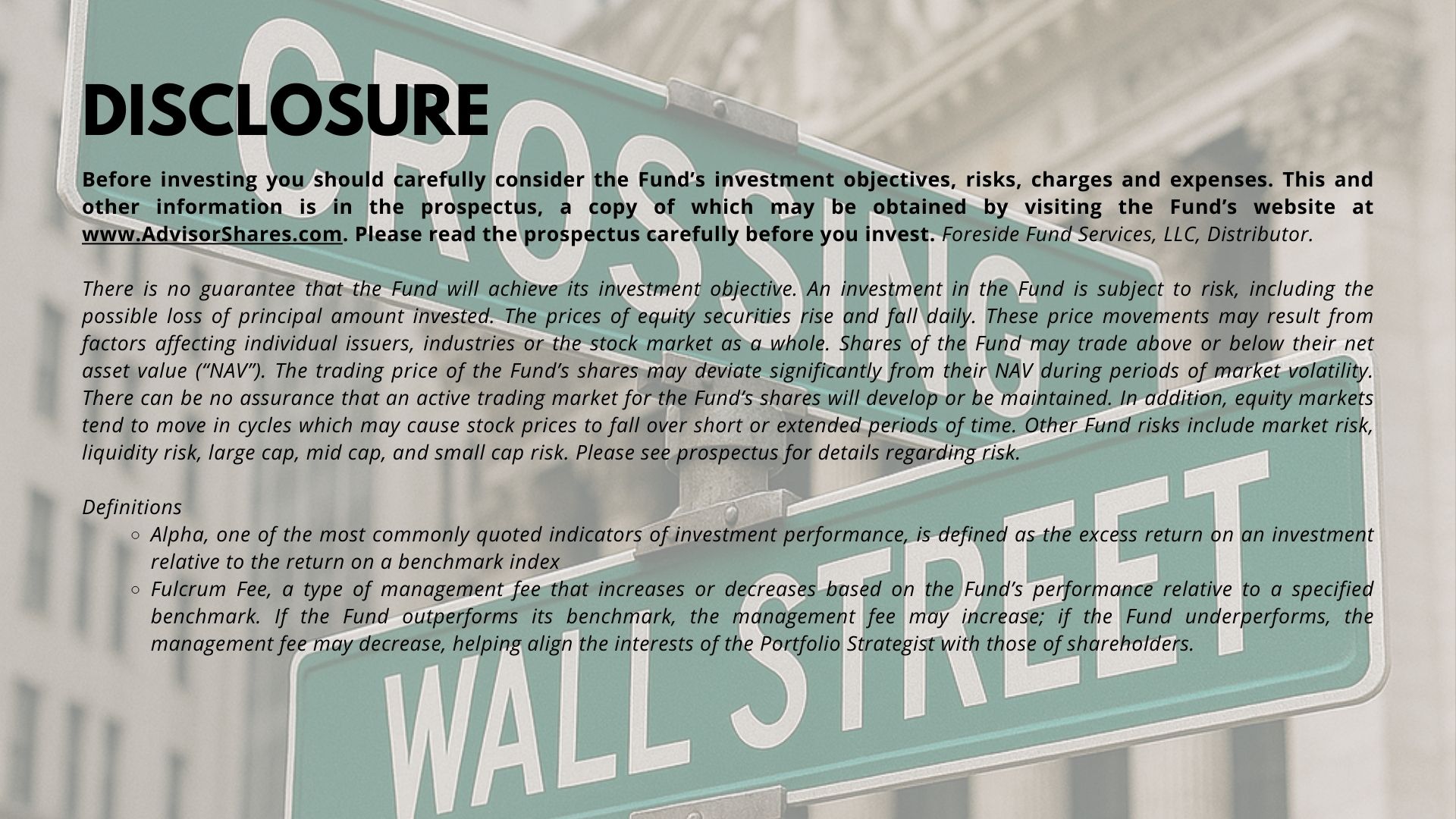 - Before investing you should carefully consider the Fund’s investment objectives, risks, charges and expenses. This and other information is in the prospectus, a copy of which may be obtained by visiting the Fund’s website at www.AdvisorShares.com. Please read the prospectus carefully before you invest. Foreside Fund Services, LLC, Distributor.