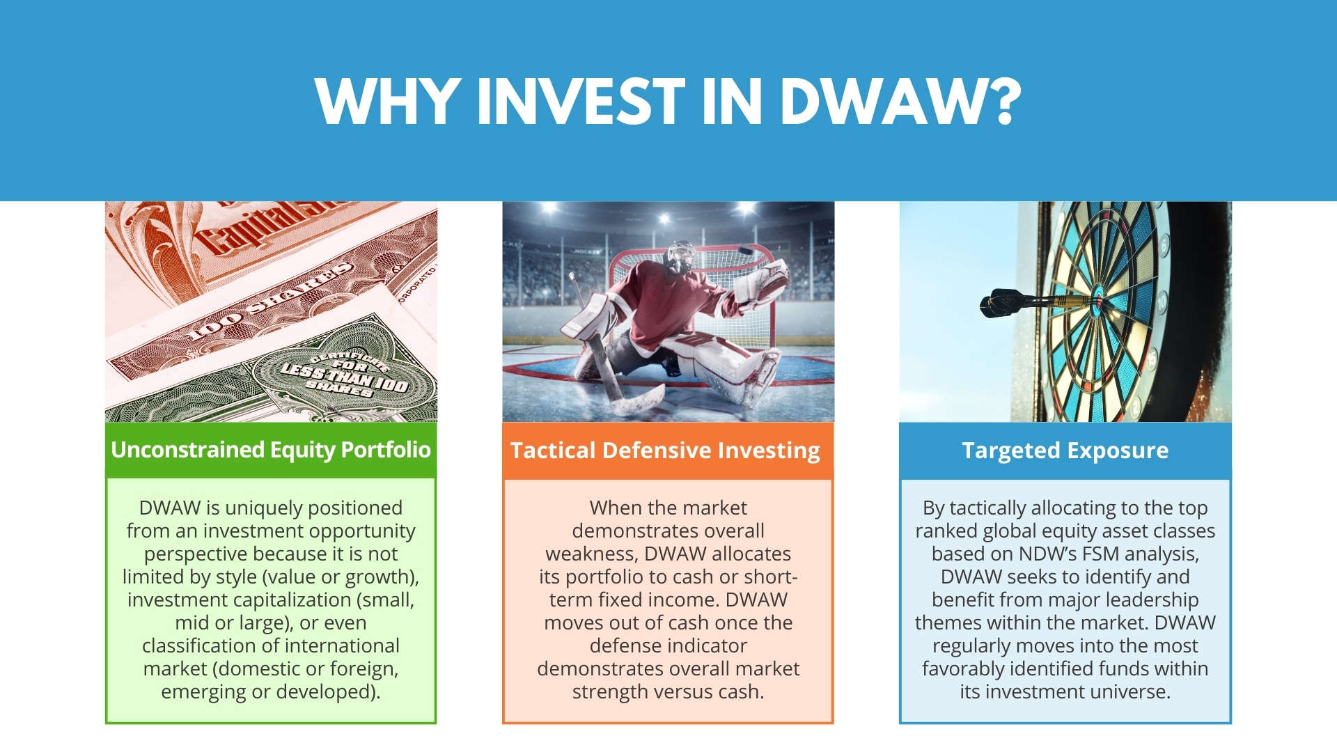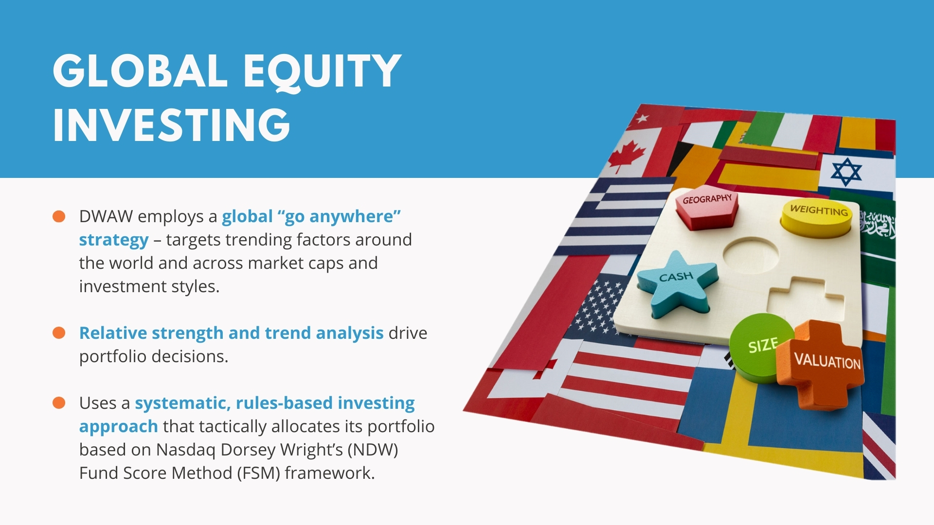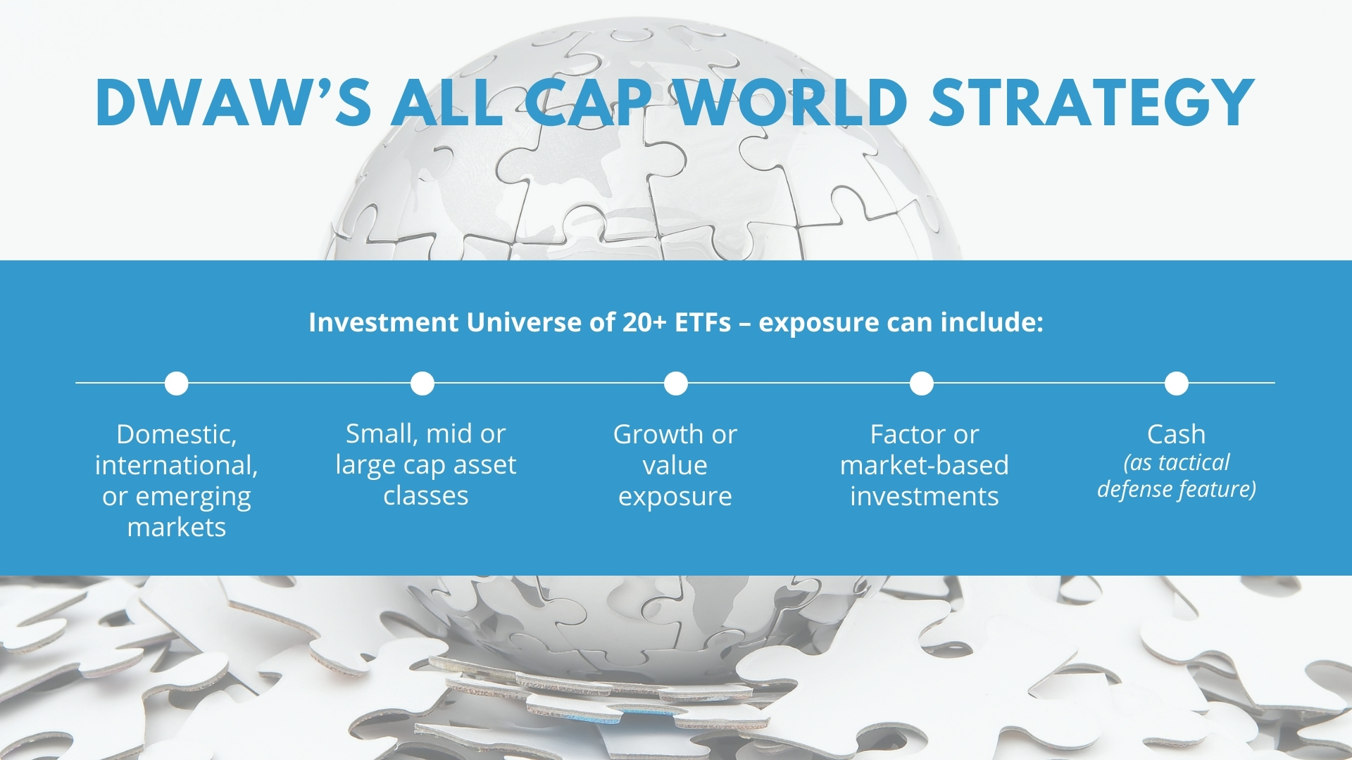 DWAW can serve as an alpha-seeking complement to a broad-based market cap weighted position, such as a fund that tracks a global index, as well as a stand-alone investment solution for world equity exposure with tactical asset allocation.