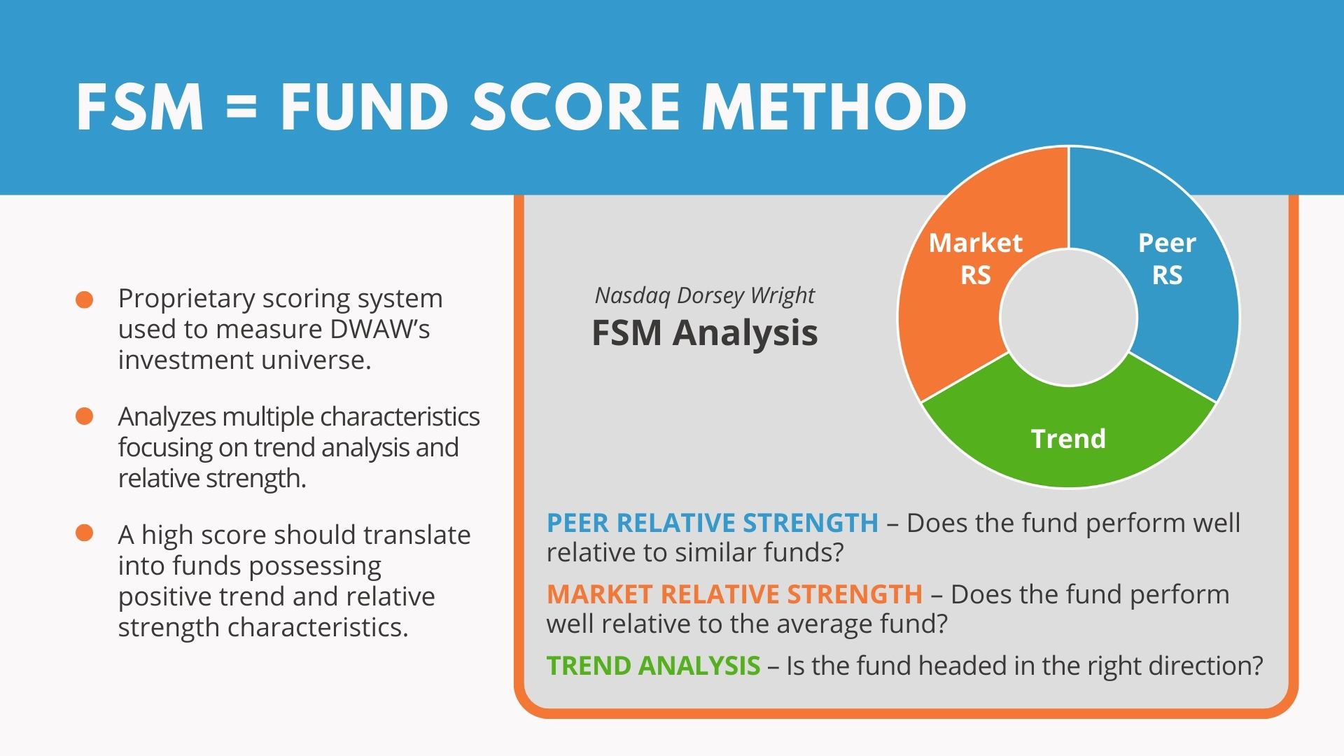 • Targeted Asset Class Exposure By tactically allocating to the top ranked asset classes based on Dorsey Wright’s FSM ranking and modeling DWAW seeks to identify and benefit from major leadership themes within the market.. The Fund Score Method (FSM) framework is designed to provide an objective, rules-based approach that has the ability to rotate between a lineup of ETFs using the Nasdaq Dorsey Wright fund score system. Every ETF on the Nasdaq Dorsey Wright research platform has a fund score ranging from 0 (weak) to 6 (strong). These scores are derived using three main areas of evaluation: trend analysis, market relative strength, and peer relative strength. DWAW will regularly rebalance on an equal weight basis into the most favorably identified funds within the FSM All Cap World investment universe.