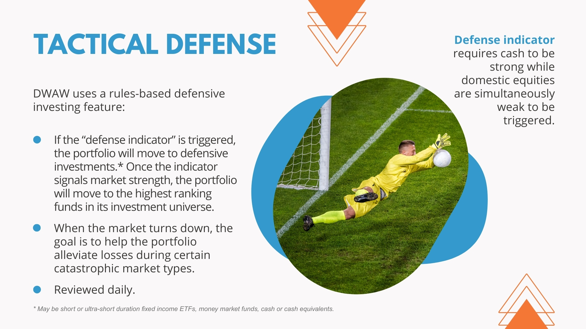 • Systematic Defense – Because we believe avoiding severe losses helps to preserve capital and can contribute to good performance over time, DWAW uses a rules-based approach to tactically add cash or short term fixed income exposure to the portfolio when momentum indicators are triggered. The temporary defensive position is to try to shield the portfolio from certain catastrophic market types.