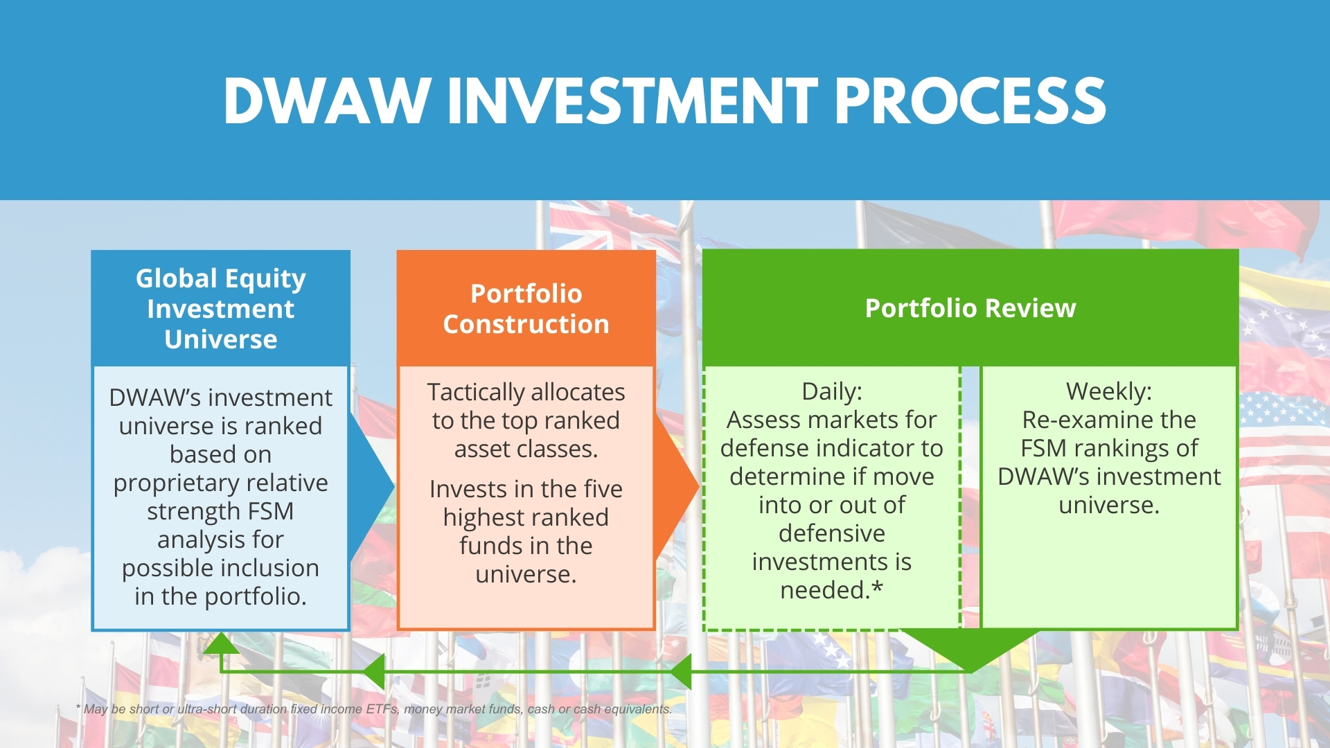 • Active Management Advantage – Many ETFs passively invest owning the majority of the stocks represented in their benchmark index, including those with less than attractive investing attributes. DWAW’s investment process systematically screens a broad variety of asset classes in the FSM All Cap World investment universe for inclusion or removal from its highly tactical, active portfolio.