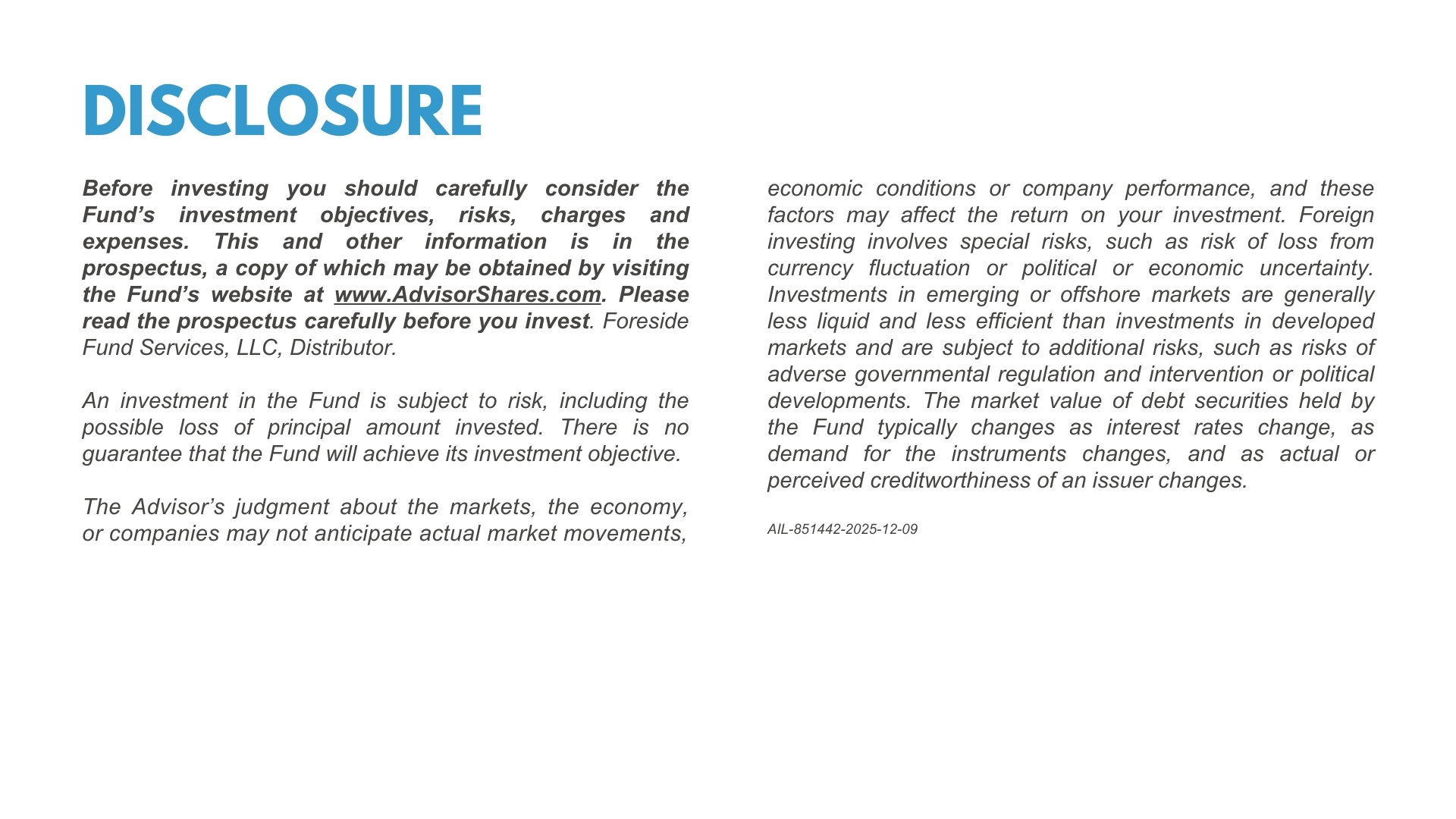 • Before investing you should carefully consider the Fund’s investment objectives, risks, charges and expenses. This and other information is in the prospectus, a copy of which may be obtained by visiting the Fund’s website at www.AdvisorShares.com. Please read the prospectus carefully before you invest. Foreside Fund Services, LLC, Distributor.