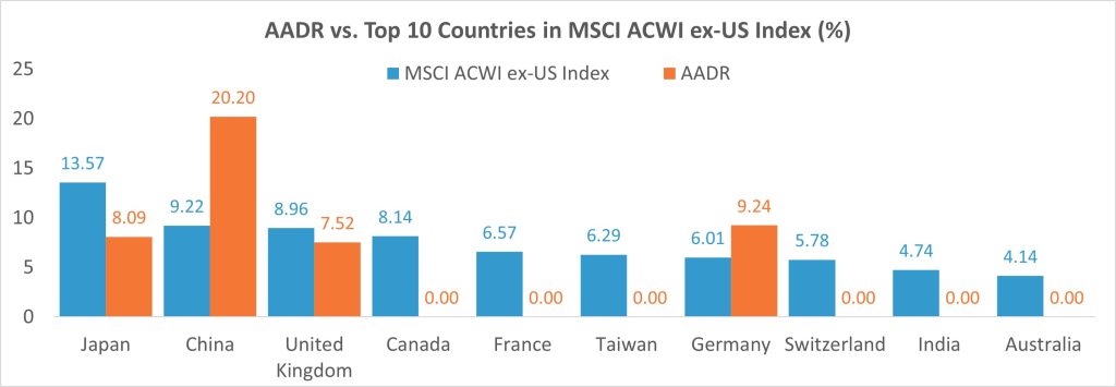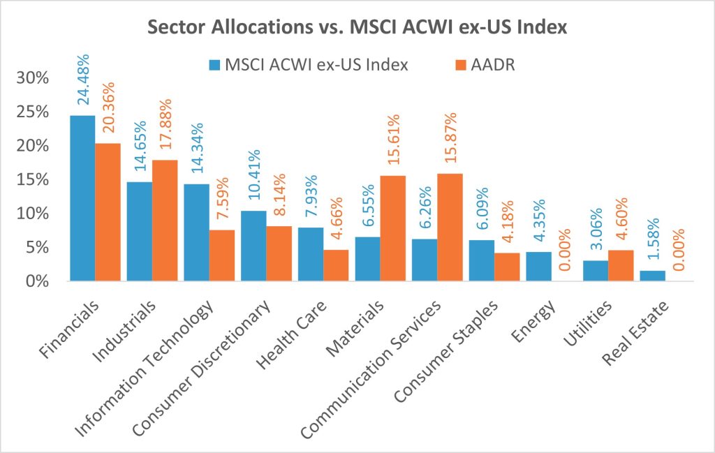 The portfolio’s process of focusing on sectors and the strength of holdings allows the portfolio to look much different than the broad market benchmark. The current allocation also looks different when comparing Developed Market vs. Emerging Market exposure. The portfolio currently holds a relatively equal allocation to Developed and Emerging (55% vs. 45%). The country allocations are also substantially different. As can be seen below, AADR holds no exposure to Canada, France, Switzerland, Taiwan, and Australia and reduced exposure to Japan and India which are all large weights in the benchmark. Instead, we have excess allocations to countries like Argentina, UK, and China where we’ve seen relative strength over the last year. At times we’ll own many countries which would never have large allocations in a passive benchmark (Argentina is a current example).