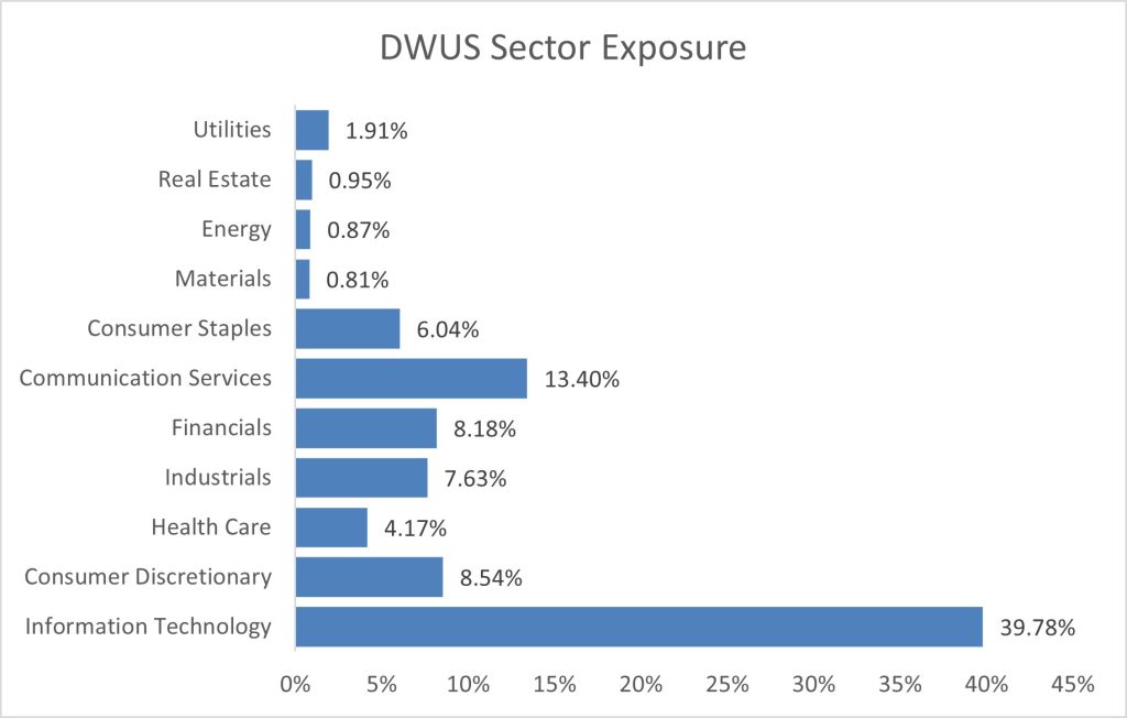 DWUS is heavily weighted towards the technology sector. Technology makes up nearly 40% of the underlying sector exposure. Communication services is the only other sector with more than 10% exposure. Energy, materials, real estate, and utilities are underweighted with each making up less than 2% of the underlying sector exposure.