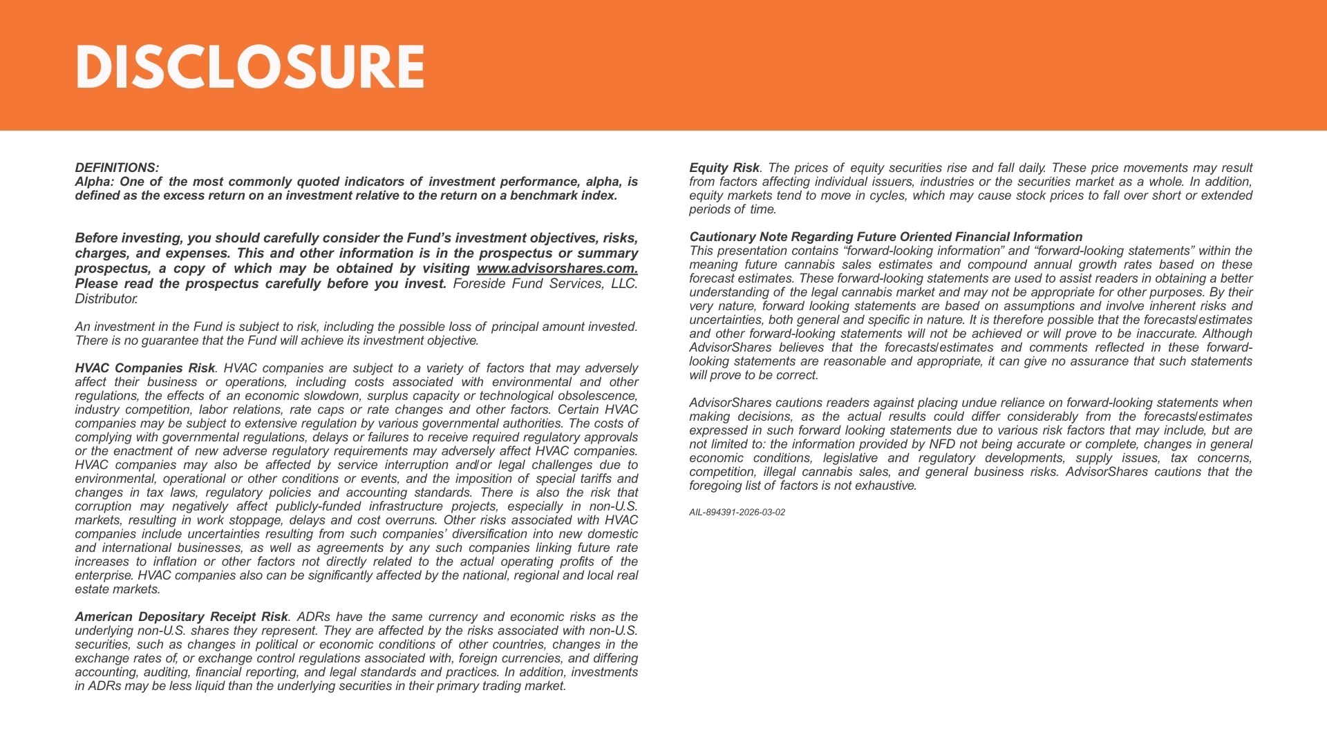 - Before investing, you should carefully consider the Fund’s investment objectives, risks, charges, and expenses. This and other information is in the prospectus or summary prospectus, a copy of which may be obtained by visiting www.advisorshares.com. Please read the prospectus carefully before you invest. Foreside Fund Services, LLC. Distributor.
