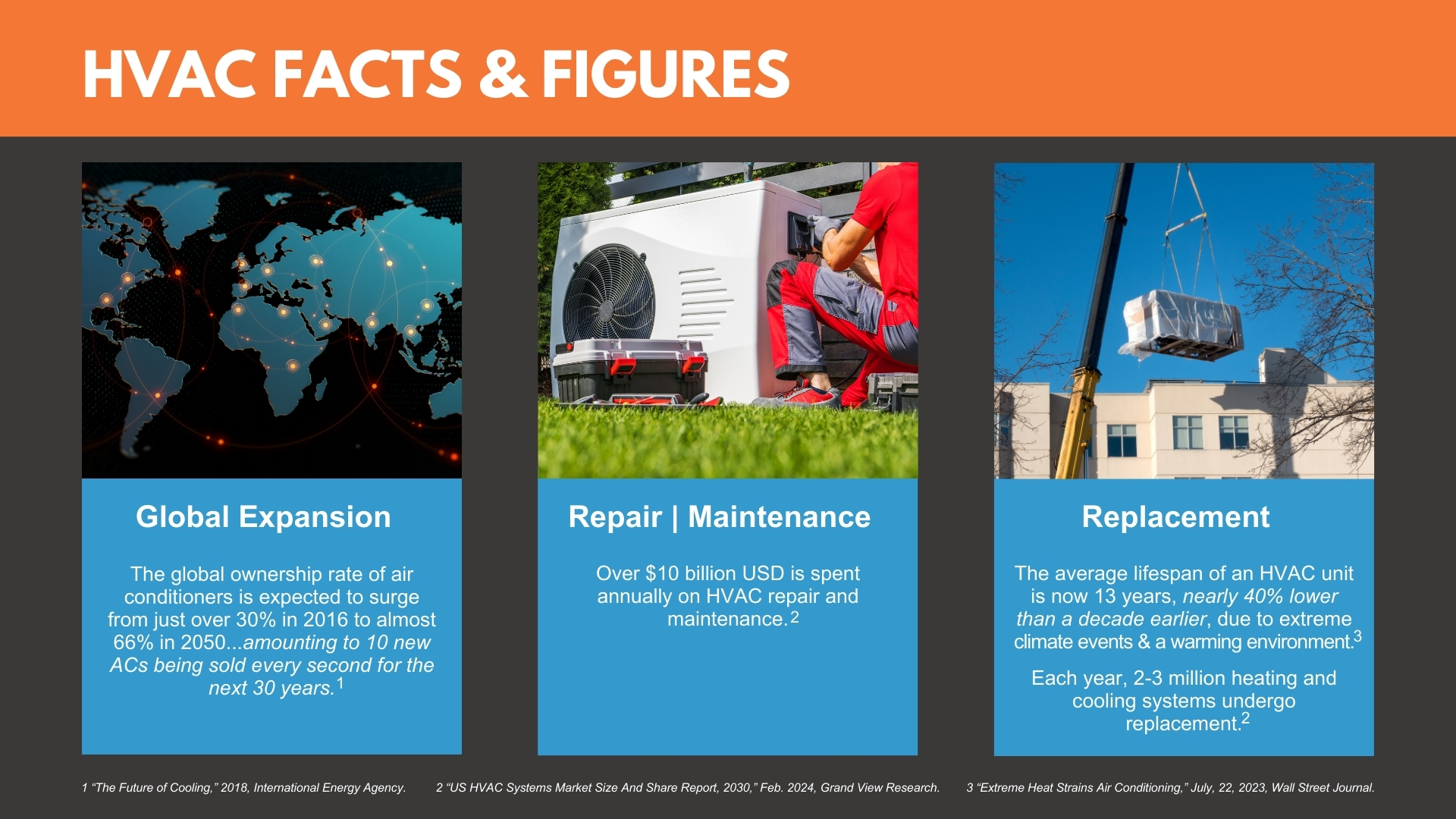 - A Warming & Expanding World: As the world heats up and populations continue to grow and urbanize, the demand for cooling is spreading to new markets – emerging countries and under-tapped developed nations – while existing markets look for more efficient and cost-effective HVAC systems.
