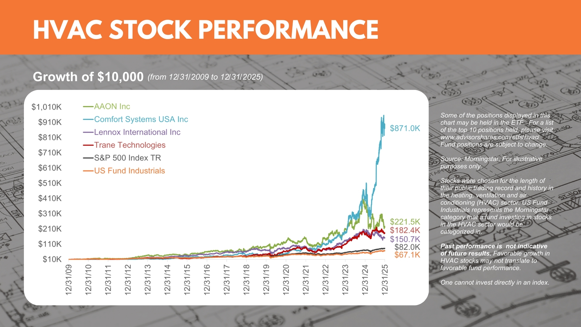 - Alpha Opportunity: Historically, heating, ventilation, and air conditioning (HVAC) stocks have shown a positive long-term trend. We believe the industry is well-positioned to capitalize on key trends, opportunities, and continued demand; and a targeted investing approach has growth potential for the future.