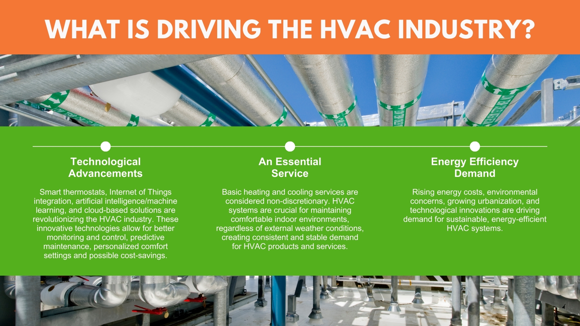 - Technology Driven: Through smart thermostats, Internet of Things integration, artificial intelligence/machine learning, and cloud-based solutions, technology is revolutionizing the HVAC industry. Technological innovation is helping HVAC systems to become more energy-efficient, reliable, and sustainable.