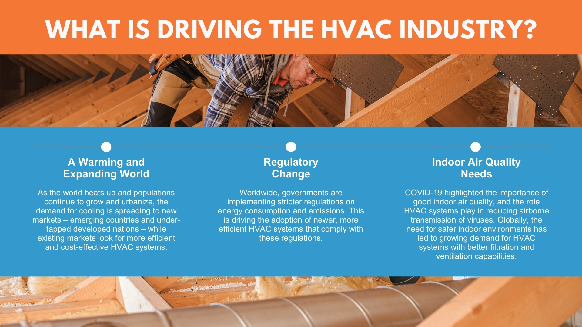- Ongoing Diverse Revenue Streams: Year-round, the HVAC industry generates revenue 1) from a variety of sources: residential, commercial, and institutional; 2) through multi-faceted services: installation, maintenance, and repair; hardware design and engineering; indoor air quality improvement; and energy-efficiency; and 3) at a wide range of price points.
