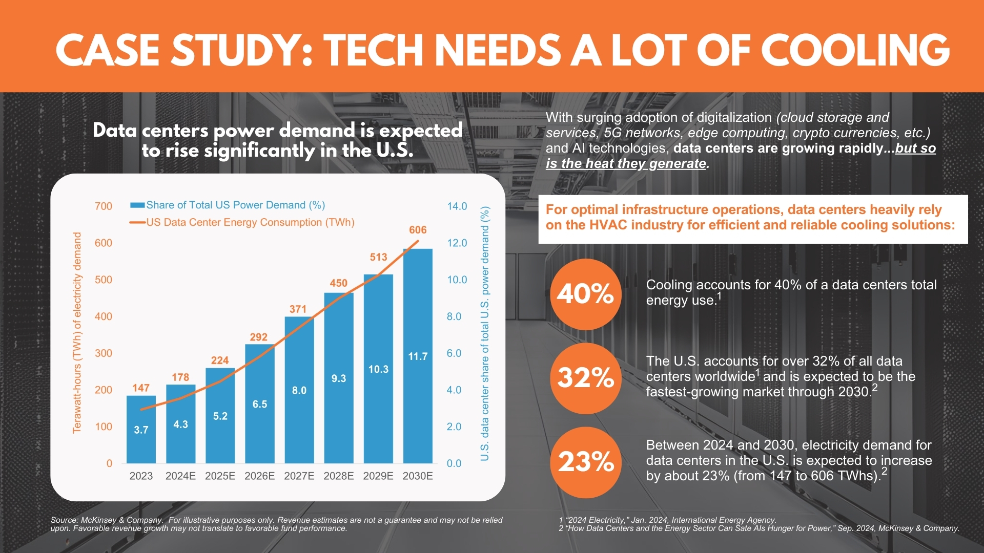 - Growing Data Center Demand: With the expansion of the digital world (i.e., AI/machine learning, cloud storage and services, 5G networks, edge computing, cryptocurrencies), data centers are growing rapidly and so is the heat they generate. For optimal infrastructure operations, data centers heavily rely on the HVAC industry for efficient and reliable cooling solutions.