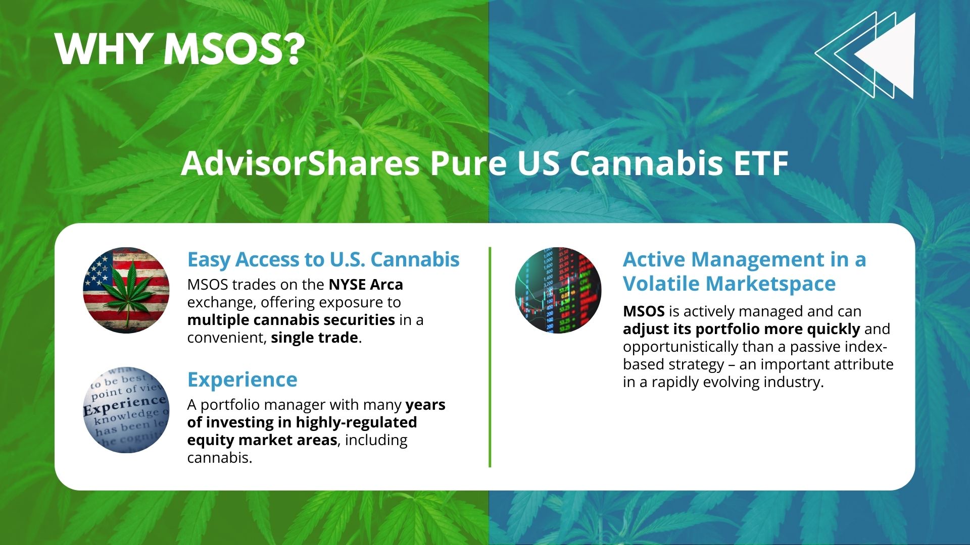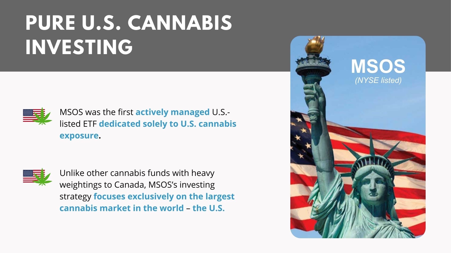 - The First U.S.-Listed ETF Available – MSOS is the first actively managed U.S.-listed ETF with dedicated cannabis exposure focusing exclusively on U.S. companies, including multi-state operators. The portfolio manager allocates across an investable universe of U.S. companies spanning a variety of cannabis-related businesses.