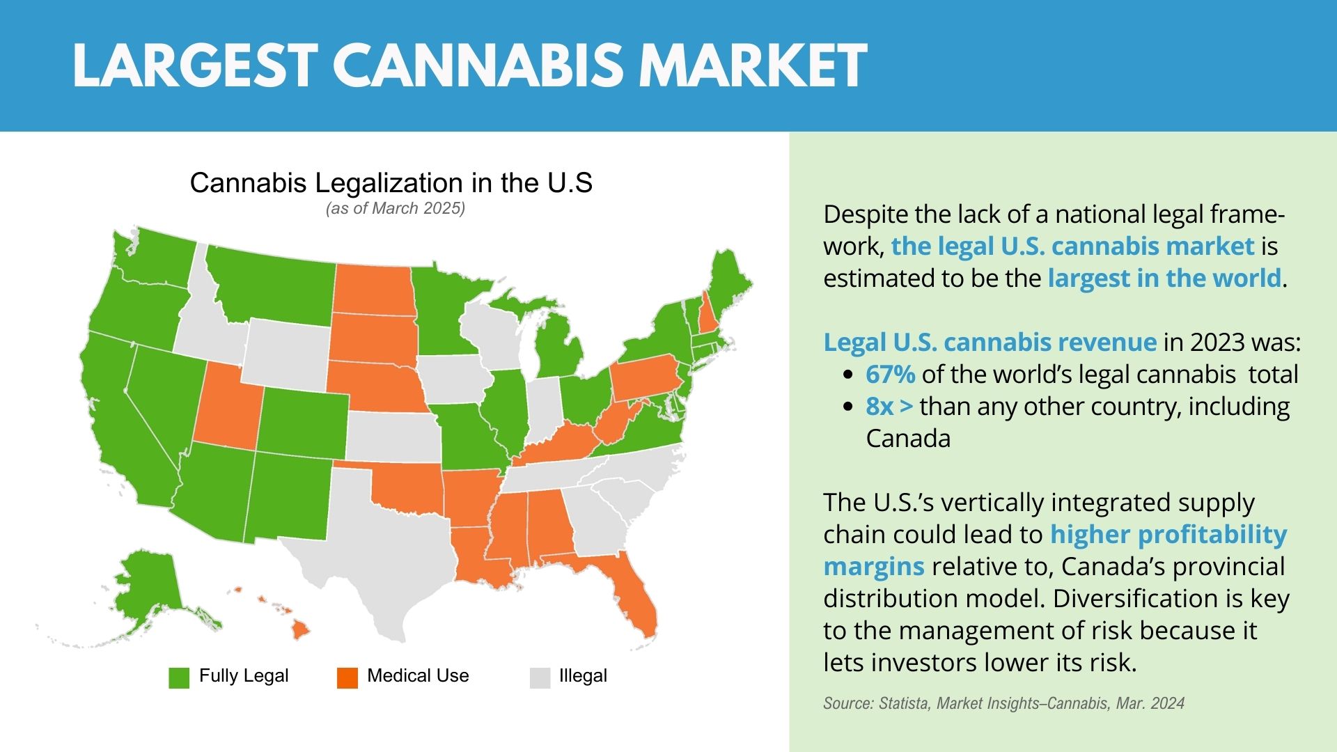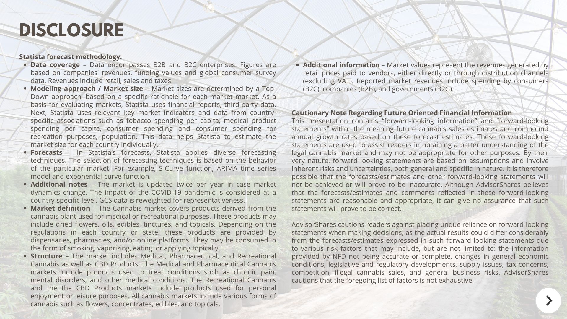 - Dedicated U.S. Cannabis Exposure – Even with limited legal availability, the U.S. cannabis market is the largest in the world and is forecast to remain so into the immediate future. The U.S. is also recognized as a leader in the cannabis space, having a reputation for creating some of the best and innovative products, as well as, mastering large scale cultivation. With exposure to U.S. companies spanning a variety of cannabis-related businesses, MSOS seeks to take advantage of this growth opportunity.