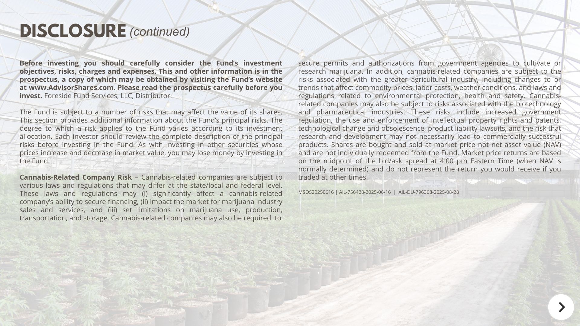 - Experience – MSOS’ portfolio manager has deep experience in the capital markets and well-established expertise investing in highly-regulated areas in the equity markets, including cannabis. MSOS assets are held by one of the largest U.S. custodial banks, BNY Mellon.