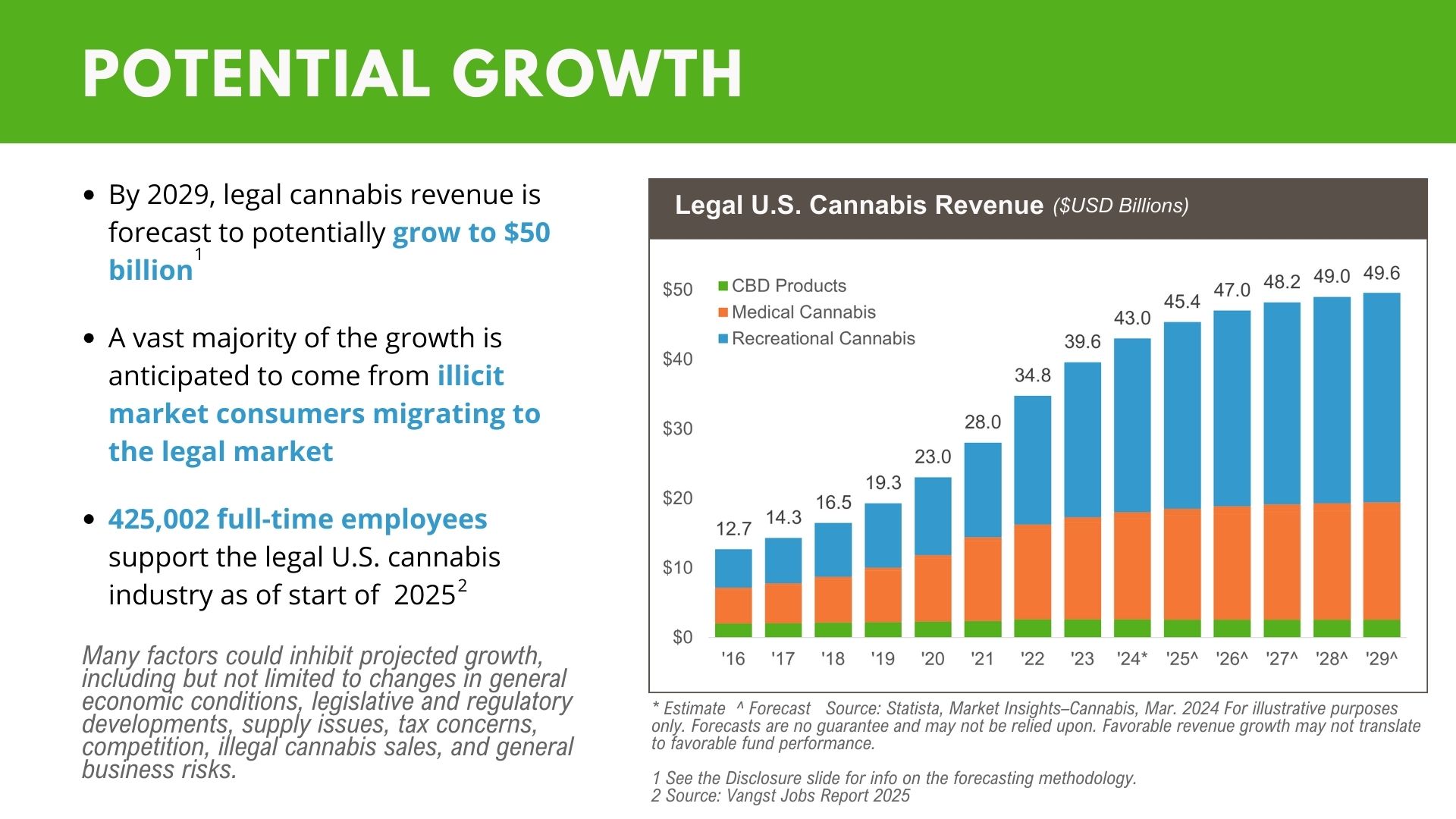 - Emerging Growth Opportunity – Cannabis securities span multiple industries including agriculture, biotechnology, pharmaceutical, real estate, retail, finance, and other medical applications. The portfolio manager believes that an evolving landscape of select, cannabis-related companies may provide upside potential that may lead to attractive growth opportunities, including the potential for merger and acquisition activity as the market matures and evolves.