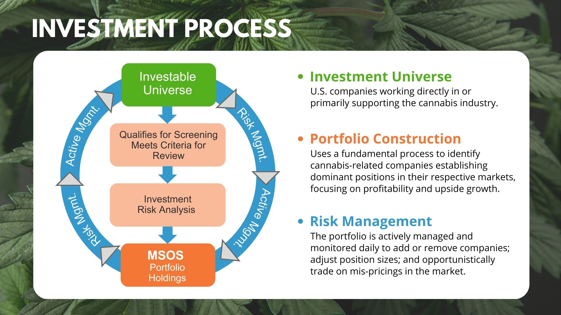 - Active Management – The cannabis marketplace is quickly evolving, witnessing ongoing innovation, and seeing an influx of new companies. Additionally, cannabis-related securities can experience fluctuation and rapid change. Using daily, active management, MSOS’ portfolio manager can adjust the portfolio more quickly and opportunistically than a passive index-based strategy that must wait for periodic rebalancing.