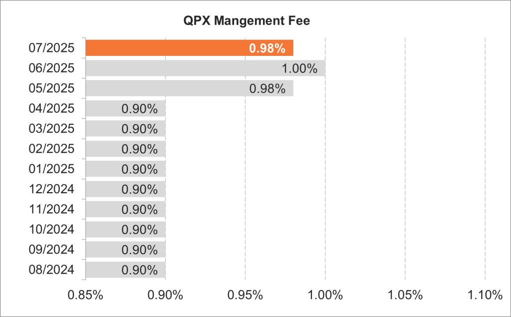 The portfolio strategist of QPX has “skin in the game.” The strategist’s compensation is directly tied to the portfolio’s performance. Using the trailing 12-month returns of QPX vs. its S&P 500 Index benchmark, stronger outperformance is rewarded with a larger management fee while weaker underperformance is penalized with a smaller management fee. The QPX fulcrum fee was 0.90% during October, November, and December 2024. After the Fund’s June performance, the QPX fulcrum fee will be 0.98% for July 2025.