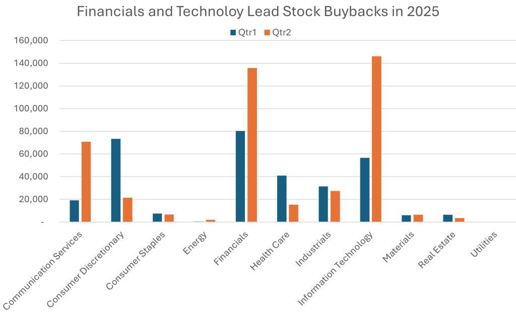 The technology sector, which added $146 billion in new buyback capacity in the previous quarter, has been the undisputed leader of this trend. Flush with cash, giants in the software and semiconductor industries have been aggressively buying back their own stock, signaling confidence in their future prospects and providing a strong floor for their share prices. The Financial sector has also been a major contributor this year. Following favorable stress test results, major banks announced significant increases in their capital return programs, including both dividends and buybacks, which helped propel the Financials sector to a strong quarterly gain. In fact, if we include the new buyback programs announced so far in July, the Financials sector is now leading all sectors with $345 billion year-to-date.
