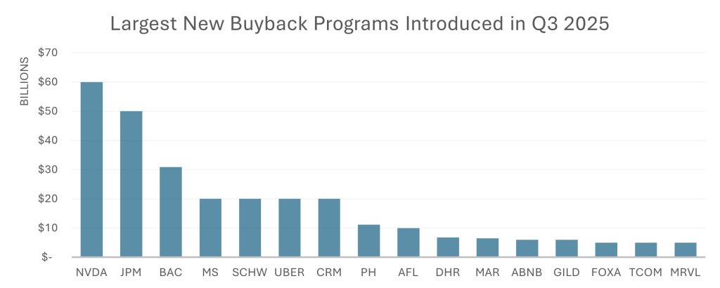 The US stock market continued to make record-setting highs in the third quarter as relentless enthusiasm and investment in AI infrastructure and related technologies fueled strong corporate earnings. The Federal Reserve also contributed to the stock market rally by executing its first interest rate cut of 2025 in September. This was a pivotal moment signaling a shift in its policy focus. Encouraged by bullish market conditions, US public companies added $383 billion of new buyback capacity in the past quarter, led by JPMorgan ($50 billion), and Bank of America ($30.9 billion).