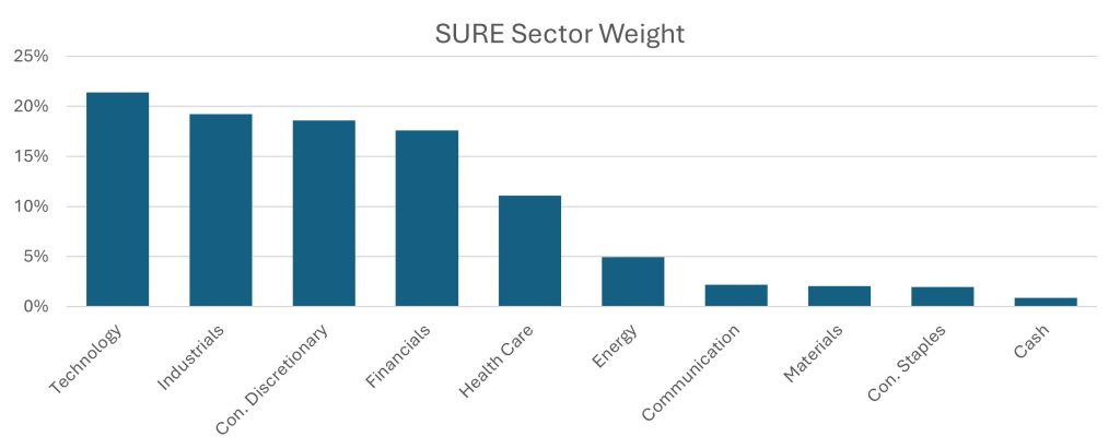 The influence of artificial intelligence, semiconductors, and technologies is hard to miss when we examine the individual positions in the SURE portfolio. The top performers in Q3, including Lam Research (LRCX), Alphabet (GOOG), Apple (AAPL), and KLA (KLAC), all belong to this theme with impressive double-digit returns. Meanwhile, SURE’s diversified portfolio also means that we could source returns from other industries, such as Caterpillar (CAT) and HCA Healthcare (HCA). In the S&P 500 Index, technology accounts for 36% of the holdings, almost three times the weight of the next biggest sector, Financials. SURE carefully adopts a much more balanced approach, as its top four sectors—Technology (21%), Industrials (19%), Consumer Discretionary (18%), and Financials (17%)—are only separated by small margins.