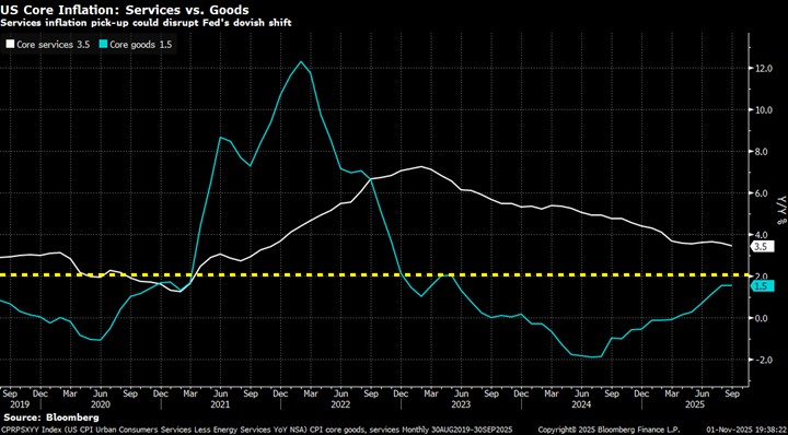 Source: Bloomberg; from 8/30/19 – 9/30/25. U.S. Consumer Price Index (CPI) Core Goods tracks the price of physical items like apparel and new/used vehicles, while CPI Services less Energy Services measures the prices of services, including housing, but excludes energy-related services.
